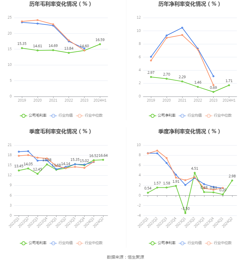 2024年上半年,公司毛利率为16.59%,同比上升2.67个百分点;净利率为1.71%,较上年同期上升0.97个百分点。从单季度指标来看,2024年第二季度公司毛利率为16.64%,同比上升2.50个百分点,环比上升0.12个百分点;净利率为2.98%,较上年同期下降1.53个百分点,较上一季度上升2.78个百分点。