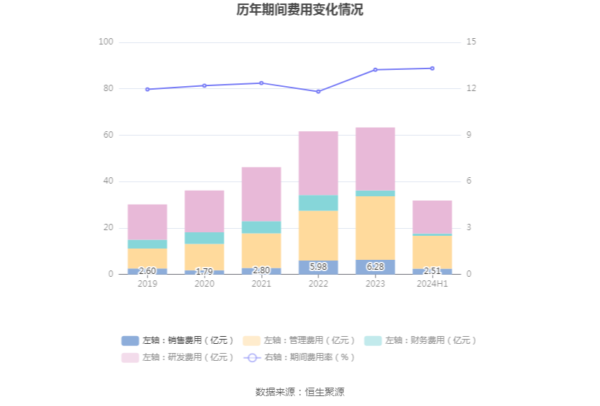 2024年上半年,公司期间费用为31.86亿元,较上年同期增加5.71亿元;期间费用率为13.32%,较上年同期上升1.56个百分点。其中,销售费用同比增长42.84%,管理费用同比增长14.67%,研发费用同比增长12.83%,财务费用由去年同期的-5214.79万元变为1.02亿元。