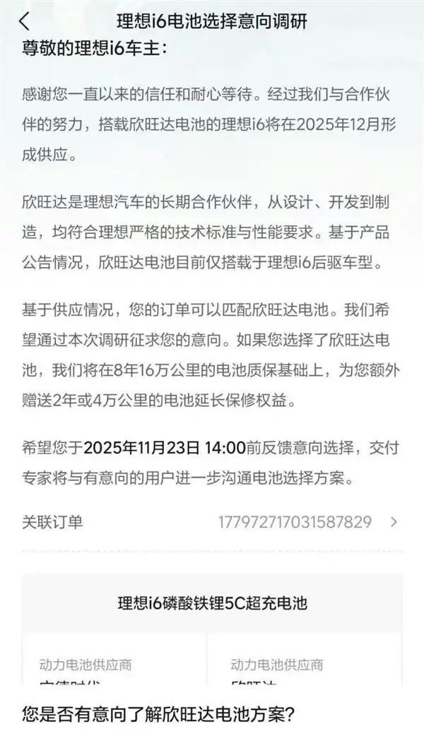 作为一个理想车主,我们现在看到的一个情况是,理想汽车非常尴尬,因为之前理想i6在发布的时候,曾经有过表述,那就是2025年的车型,都会搭载宁德时代的电池,但是随着理想i6的订单数量明显增长,宁德时代的电池供应明显不足。所以理想汽车就给了用户一个选择,如果选择欣旺达的电池,可以更快提车,之前在发问卷调查的时候,也询问用户是否愿意选择欣旺达电池,可在原有8年或者16万公里的质保基础上,额外获得2年或者4万公里质保。