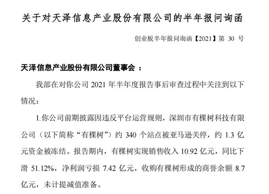 从一年大赚4个亿到半年亏掉7个亿,有棵树的经营情况缘何快速恶化?9日早间,深交所在向公司下发的半年报问询函明确提出,要求公司充分提示有棵树被亚马逊关停店铺等事项是否会给公司经营活动造成进一步影响,并要求公司充分提示风险。