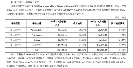 令投资者担心的是,作为有棵树跨境电商业务重要组成部分的亚马逊业务(收入占比为30.74%)上半年呈现出大幅下滑态势,公司在半年报中也提示:有棵树经营业绩短期内存在进一步下滑的风险。