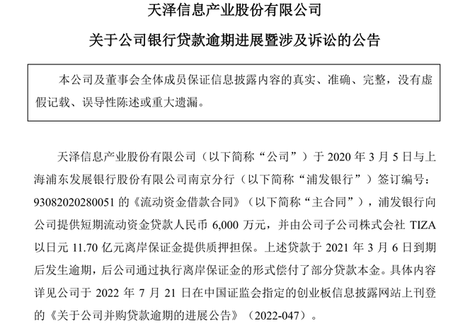 具体细节为,天泽信息于 2020 年 3 月 6 日向上海浦东发展银行股份有限公司南京分行借款人民币 6,000.00 万元,借款期限为 2020 年 3 月 6 日至 2021 年 3 月 6 日。其子公司株式会社 TIZA 以 117,000.00 万日元的离岸保证金为上述借款提供质押担保。