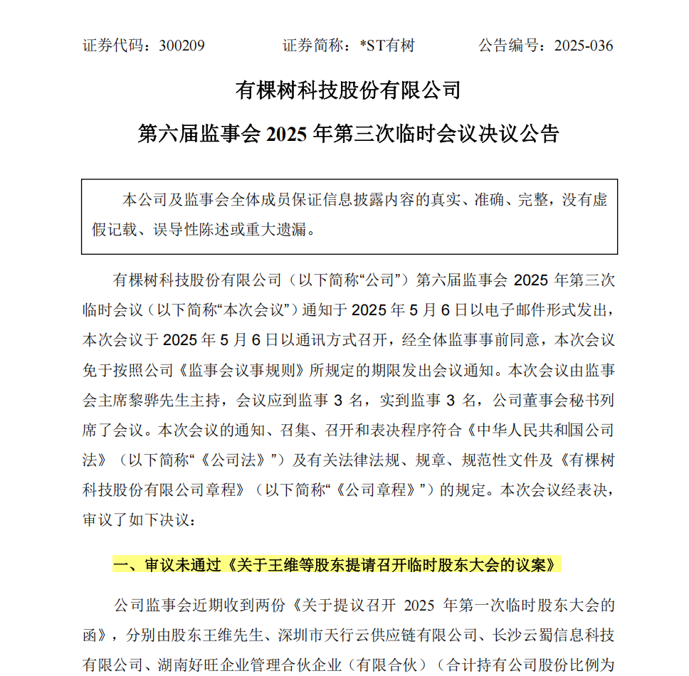 *ST有树董事会给出三大理由:现任董事任期未届满、现任董事会成员有义务继续勤勉尽责、股东王维涉嫌滥用股东权利。