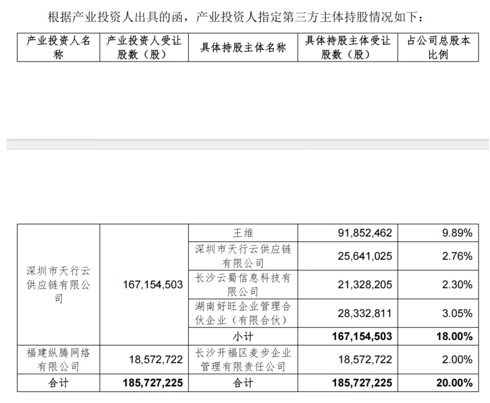 该函由两方面股东发出,一个是刚刚入主的产业投资人及其指定持股主体股东,包括王维、深圳市天行云供应链有限公司(下称“深圳天行云”)、长沙云蜀信息科技有限公司(下称“长沙云蜀”)、湖南好旺企业管理合伙企业(有限合伙)(下称“湖南好旺”),合计持有公司股份比例为18%。