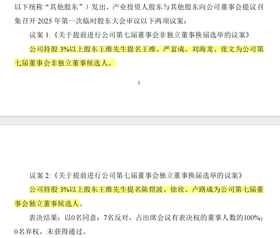 公告显示,上述产业投资人股东与其他股东向上市公司董事会提议召集召开2025年第一次临时股东大会并审议两项议案,直指进行董事会“断层式换届”。