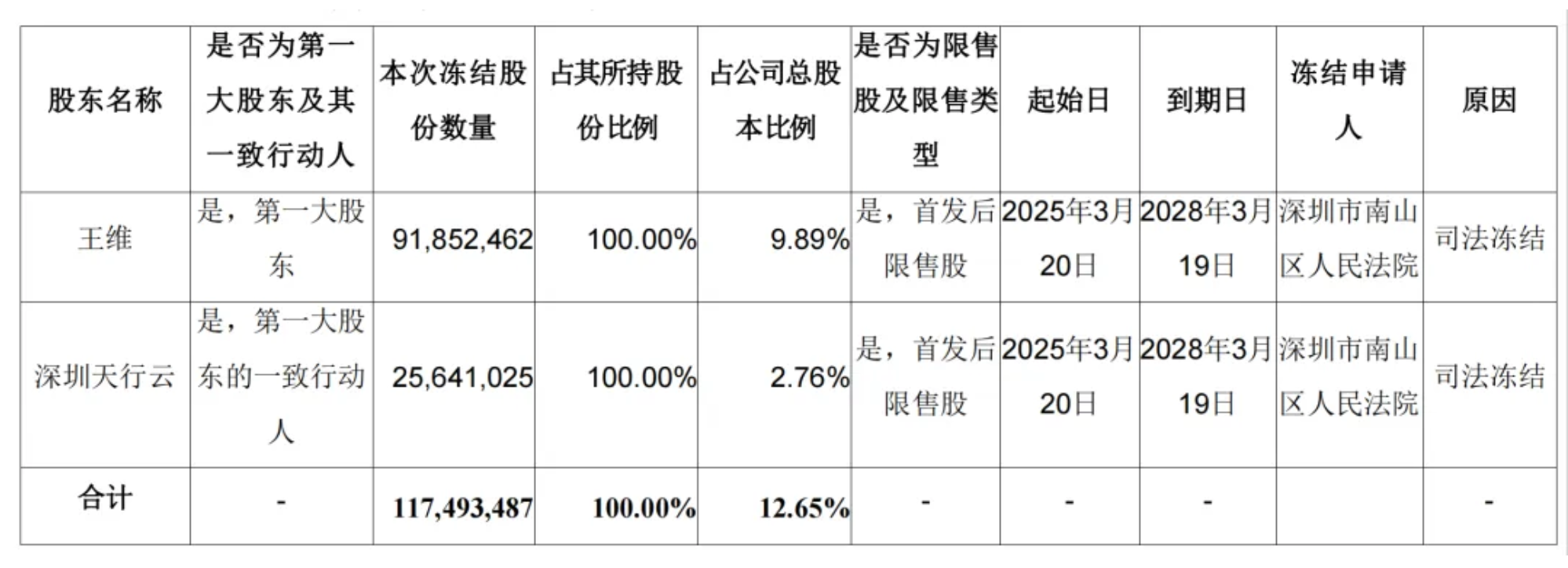 值得注意的是,4月下旬,*ST有树发布公告称,第一大股东王维及其一致行动人深圳天行云合计持有的*ST有树12.65%股份全部遭到司法冻结,冻结申请人为深圳市南山区人民法院,冻结日期为2025年3月20日至2028年3月19日。公告并未披露司法冻结的具体缘由。
