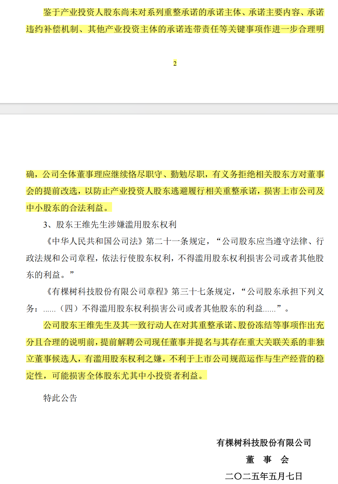 此外,*ST有树认为,股东王维涉嫌滥用股东权利。“公司股东王维及其一致行动人在对其重整承诺、股份冻结等事项作出充分且合理的说明前,提前解聘公司现任董事并提名与其存在重大关联关系的非独立董事候选人,有滥用股东权利之嫌,不利于上市公司规范运作与生产经营的稳定性,可能损害全体股东尤其中小投资者利益。”