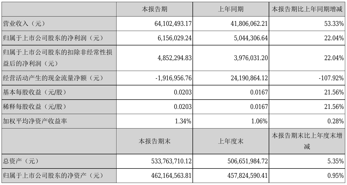 挖贝网8月11日,亿通科技(300211)近日发布2021年半年度报告,报告期内营业收入64,102,493.17元,同比增加53.33%;净利6,156,029.24元,同比净利增加22.04%。