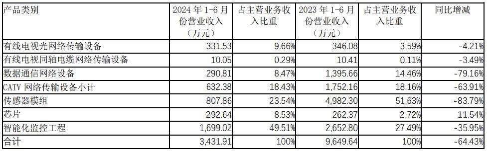 具体来看,公司传感器模组、数据通信网络设备、CATV网络传输设备小计、智能化监控工程分别实现营收807.86万元、290.81万元、632.38万元、1699.02万元,同比分别下降83.79%、79.16%、63.91%、35.95%。