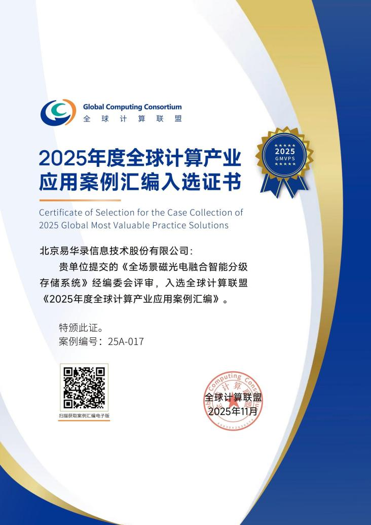 近日, 易华录 研发的“全场景磁光电融合智能分级存储系统”成功入选《2025年度全球计算产业应用案例汇编》,为全球数据存储行业提供了创新解决方案。