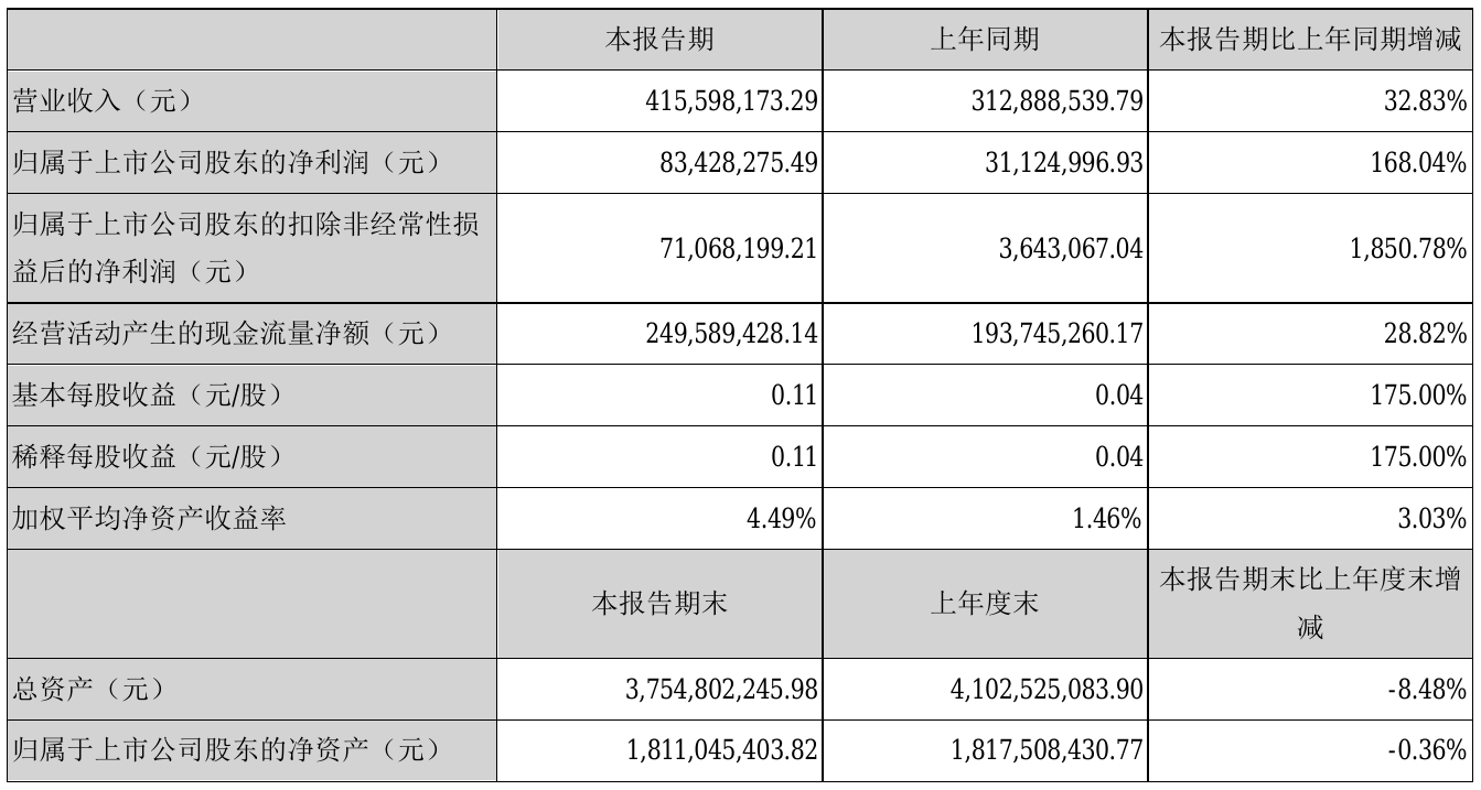 8月26日,电科院(300215)近日发布2021年半年度报告,报告期内营业收入415,598,173.29元,同比增加32.83%;净利83,428,275.49元,同比净利增加168.04%。