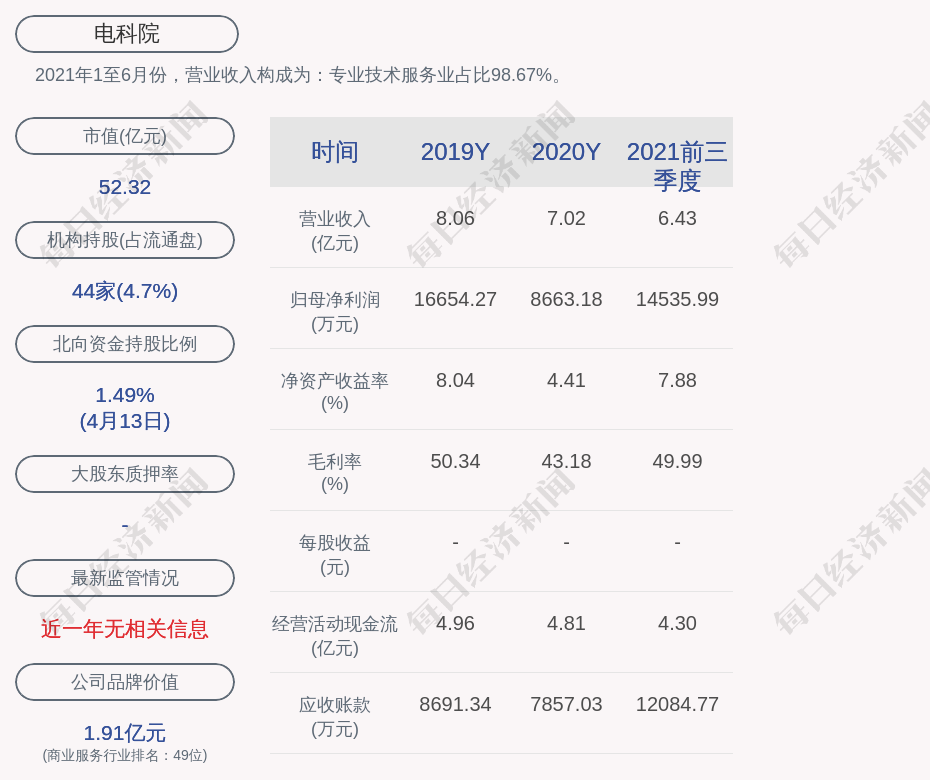 2021年1至6月份,电科院的营业收入构成为:专业技术服务业占比98.67%。