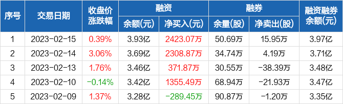 融资方面,当日融资买入6783.9万元,融资偿还4360.83万元,融资净买入2423.07万元,连续4日净买入累计6459.3万元。融券方面,融券卖出22万股,融券偿还6.05万股,融券余量50.69万股,融券余额394.37万元。融资融券余额合计3.97亿元。