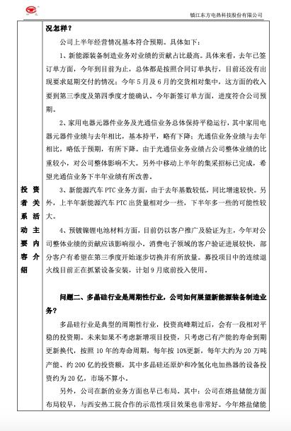 镇江东方电热科技股份有限公司(以下简称“东方电热”或“公司”)7月14日晚间发布公告称,公司于近日接受了多家机构投资者的特定对象调研。在调研中,东方电热透露,多晶硅行业的市场波动可能会导致公司新能源装备制造业务销售收入在短期内有所波动,但是公司预计,两到三年之内,新能源装备制造业务业绩会趋于稳定,同时随着新布局产品的市场推广应用,公司这个板块的业务收入有希望逐步上升。