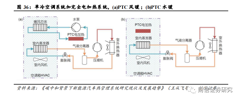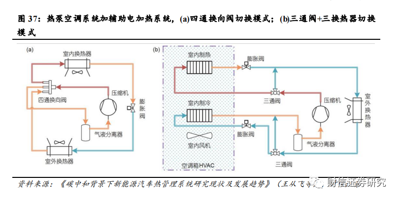 PTC电加热器作为新能源车的重要组成部分,将随着新能源车行业迎来爆发式增长机遇。在解决舒适性、电池寿命问题的同时,因电加热耗电导致续航里程降低的现象成为新能源汽车推广的重要话题。不同于燃油车采用发动机余热制热,新能源车的制热模式主要有PTC、热泵两种。其中PTC制热是通过电热丝加热的方式进行,优点是成本低,在极端低温下可正常工作,缺点是能耗高,对里程影响较大,且存在一定的安全隐患;热泵空调的原理与家用空调类似,通过四通阀将冷凝器和蒸发器的功能对调,改变冷媒方向,达到制冷和制热效果的随时切换。与PTC相比,热泵至少可减少50%的能耗,延长20%及以上的里程,但其成本高出PTC数倍,且在-10℃以下无法正常工作。目前PTC电加热器仍是主流方案,而热泵目前只被部分高端车型采用,热泵完全取代PTC加热器的可能性很小,主要基于以下两点:一是热泵系统本身也需要配套PTC电加热器,以保证热泵系统能够快速启动及尽快进入稳定工作状态。二是热泵的单车价格较高,车企有成本压力。