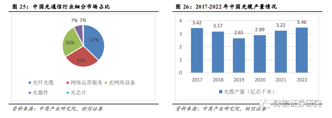 我国光通信产业主要由光纤光缆、网络运营服务、光网络设备、光芯片等组成,其中光纤光缆市场占比最大,达37%。目前光纤光缆行业处于成熟期,市场竞争充分,下游客户相对强势,市场需求较大程度受到通信技术更新换代、国家政策导向等因素的影响。整个光通信行业在2019年由于5G商用进展及投资进度不及预期,市场需求增长迟缓,光缆市场甚至存在供大于求的情况。2019年以后,市场景气度好转,光缆迎来了需求上涨和价格触底反弹,产量开始恢复增长,2019年后中国光缆产量呈现稳定上升的趋势,2022年光缆产量达3.46亿芯千米,同比增长6.6%,2023年1-7月份,光缆累计产量已达1.92亿芯千米。
