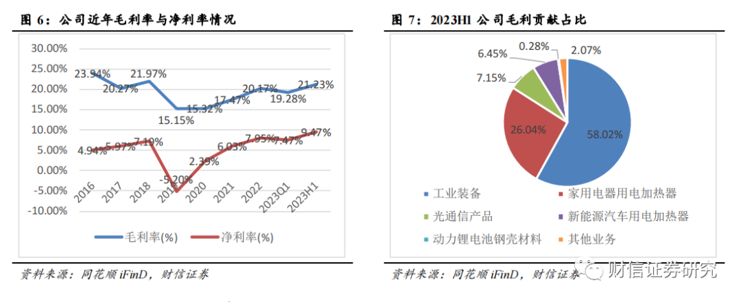 盈利能力整体稳健,新能源装备制造业务毛利贡献大。2019年由于民用电加热器业务销售单价下降幅度超过材料单价的下降幅度,且工业装备制造业务竞争加剧,导致价格下降较多,公司盈利能力下滑。2020年毛利率开始企稳回升,净利率由负转正,2023H1公司毛利率为21.23%,同比提升0.83pcts,净利率为9.47%,同比提升1.10pcts。从细分业务来看,近年来公司新能源装备制造业务毛利率维持最高,2023H1毛利率为25.49%,且毛利贡献最大,2023H1贡献毛利2.52亿元,占公司毛利的58.02%。