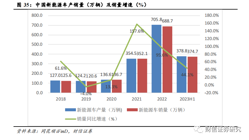新能源车行业维持高景气度,产销两旺。在“双碳”目标下,全球电动化势不可挡,2021年开始,新能源车行业步入高速发展期,我国为全球新能源车第一大市场,前景广阔。2023年上半年,受新能源汽车下乡、充电桩下乡以及购置税减免政策等产业政策影响,我国新能源汽车产销继续保持快速增长,2023H1新能源汽车产销分别完成378.8万辆和374.7万辆,同比分别增长42.4%及44.1%,对应销量渗透率达28.3%。目前,我国三线及以下城市新能源汽车渗透率仍较低,随着包括充电设施适当提前布局等国家利好政策的出台,未来几年内三四线以下城市乃至农村地区有望成为新能源汽车销量增长的主要市场,从而带动新能源汽车行业保持高速增长。