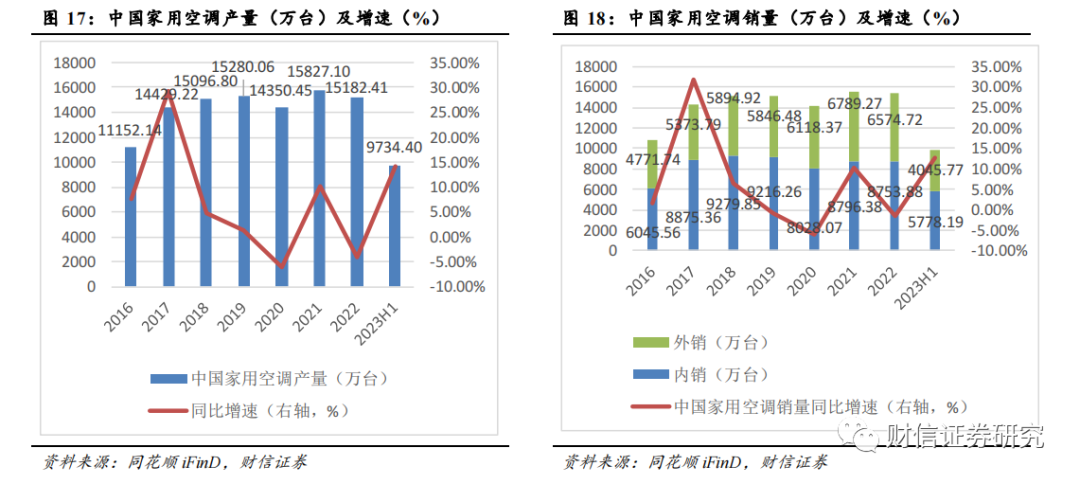 (1)家用空调行业:成熟型行业,进入存量市场状态已成为行业共识。我国家用空调市场需求长期相对稳定,从产销量数据来看整体增长空间不大,以内生性增长为主,即空调更新换代为主。2023上半年,受消费环境好转、高温天气及空调企业补库存等因素影响,家用空调产销增长幅度超出预期:根据产业在线统计,2023年上半年,家用空调生产总量为9734.40万台,同比增长14.15%;销量9823.96万台,同比增长12.72%;其中内销5778.19万台,同比增长24.78%;外销4045.77万台,同比下降0.95%。
