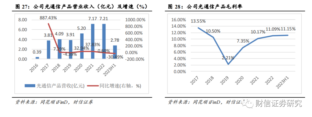 公司业务营收整体稳中有升,毛利率已逐渐恢复。2017年,光通信行业快速发展,受市场需求驱动,公司光通信业务营收快速增长,同比增速超800%。而在2019年,市场环境发生较大变化,国内三大通信运营商招标价格突然大幅下降,平均降幅均超过30%,远超市场预期,间接导致江苏九天的产品销售价格下降,毛利率大幅降低,光通信业务营收首次出现负增长。2019年后受到相关政策的积极引导,市场需求也开始逐渐恢复,公司光通信业务营收逐年增长,2023年上半年由于市场竞争激烈,公司销量变化不大,但受产品价格下降较大影响,光通信产品营收同比有所下降,下半年随着中国移动的集采落地,下半年预计将有好转。此外,业务毛利率也逐渐回升,2023H1公司光通信产品毛利率为11.15%,已基本恢复至2018年水平。