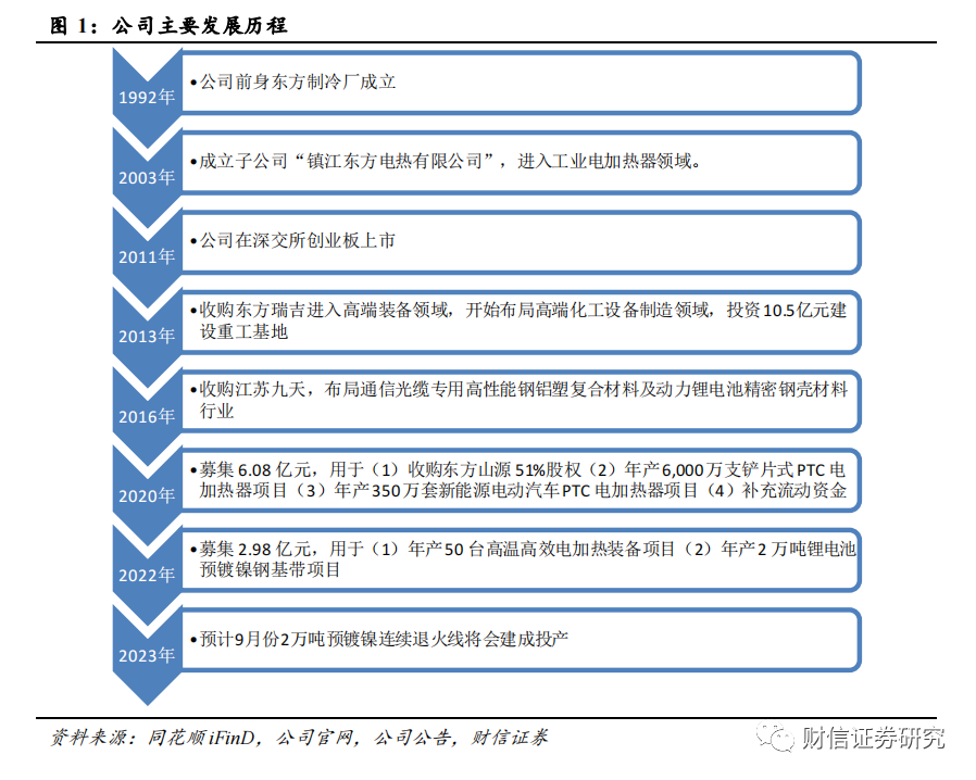 国内民用电加热龙头,积极布局新能源业务:东方电热创立于1992 年,前身为东方制冷厂,2000年改制设立东方制冷,2006年公司以其控股子公司镇江东方为平台,进军高端工业用电加热器领域;至2009年公司整体变更为东方电热,并于2011年创业板上市;2013年,公司收购东方瑞吉,开始布局高端化工设备制造领域;2016年,公司收购江苏九天51%股权,布局光通信钢铝塑复合材料和动力锂电池钢壳材料行业;2017年,公司研制的多晶硅还原炉投放市场,进一步切入多晶硅装备制造行业。经过多年的发展,公司已形成家用电器(元器件)、新能源(装备制造、汽车元器件及锂电池材料)和光通信(材料)三大主要业务板块并行,以新能源行业为重点发展方向的业务格局。