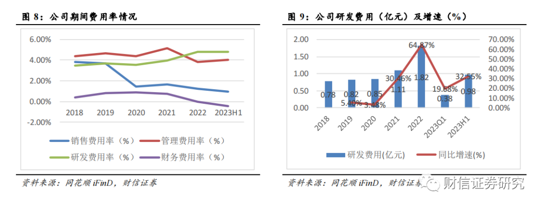 成本费用管控能力较好,以降本增效为目的的研发投入逐年增长。2020年由于运输费减少,公司销售费用同比减少58.31%,销售费用率大幅下滑,同比下降2.26pcts,其余各项期间费用率基本维持稳定。研发投入方面,2022年公司共投入研发费用1.82亿元,同比增长64.87%,共取得54项专利授权证书,并且为降本增效,在保证产品质量的前提下,对部分生产工艺进行改善,部分辅助材料进行更换,部分产品的工序过程控制进行改进,部分产品工序进行优化。2023H1投入研发费用0.98亿元,同比增长32.55%,维持高增长。