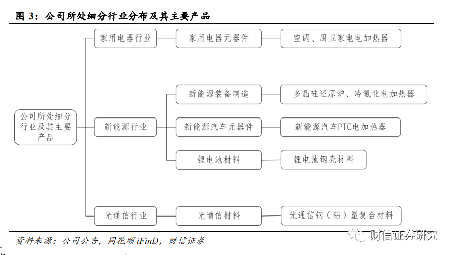 国内民用电加热龙头,积极布局新能源业务:公司以电加热技术为核心,广泛拓展电加热技术及热管理系统的应用领域,目前已形成家用电器(元器件)、新能源(装备制造、汽车元器件及锂电池材料)和光通信(材料)三大主要业务板块并行,以新能源行业为重点发展方向的业务格局。