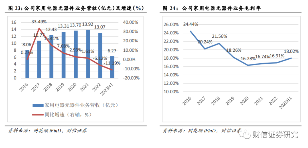 公司家电元器件业务营收稳健,盈利能力逐渐恢复。受到下游空调客户需求下降及行业价格年降影响,公司的家用电器元器件业务营收增速逐年下降,随着消费环境好转,厨卫、小家电行业需求逐步释放,在未来2-3年内预计公司业务营收会有增长但增速不高,总体将保持平稳发展态势。毛利率方面,主要受到下游空调企业压低采购价格影响,近年来公司家电元器件业务毛利率有较大下降,但2020年后已开始逐渐回升,2023H1毛利率为18.02%,同比微增0.29pcts。为提升毛利率,由于铲片式PTC电加热器毛利率较高,公司大力推进产品升级迭代,全面推广铲片式PTC电加热器,同时持续加强成本控制,降低生产成本。此外,公司还积极搭建海外销售渠道,建立海外销售团队,以逐步提升产品外销比重,预计未来公司家电元器件业务盈利能力将继续有所回升。