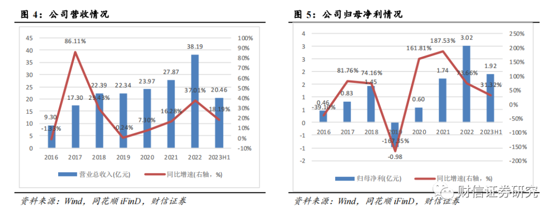 业绩整体稳步增长,低点已过。2016-2022年公司营收整体稳步增长,但2019年受到公司主要产品价格有所下降、新能源汽车行业补贴大幅退坡、5G商用进展及投资进度不及预期等多重因素影响,公司首次出现亏损,实现营收22.34元,同比下降0.24%,实现归母净利-0.98亿元,同比下降167.35%。