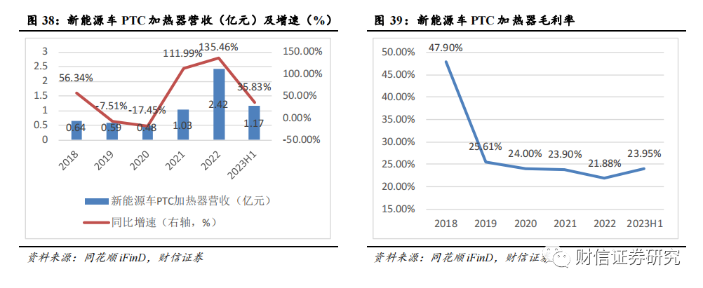 业务毛利率下滑不具有可持续性。2019年,公司新能源车PTC业务毛利率大幅下降,主要是受到新能源汽车补贴政策变化和新项目建成投产后折旧等其它固定费用增加的双重影响。近几年已基本维持稳定,2023H1毛利率同比微增,为23.95%。此外,由于公司新签定点的产品基本上都是成套电加热系统,价格相对较高,有利于稳定产品毛利率。