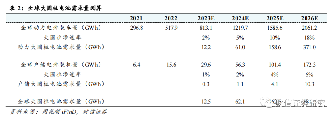 综合考虑目前的市场情况,假设如下:(1)动力电池装车量在2026年达到2061.2GWh,同时大圆柱电池在动力电池中的渗透率达到18%;(2)户储电池装车量在2026年达到172.3GWh,大圆柱电池渗透率达到6%。