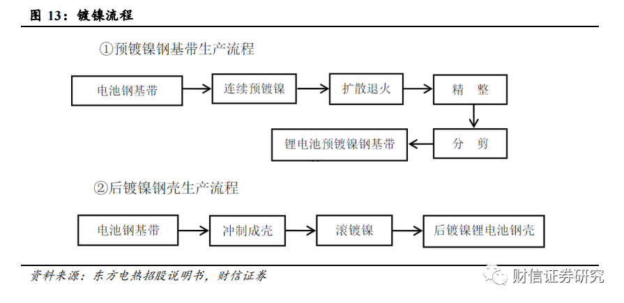 不同于方形电池的铝壳,大圆柱电池采用镀镍钢壳作为封装材料:由于对耐压强度的要求,大圆柱通常采用钢壳作为封装壳体,而锂电池钢壳的原材料主要是钢带,其生产流程包括清洗、连轧、退火、分剪、镀镍和冲制等流程。其中镀镍环节分为预镀镍和后镀镍两种工艺,是为了防止电池正极活性材料对钢壳氧化,增强耐腐蚀性的一种方式。预镀镍工艺是一种在电池壳冲压之前对基础钢材进行镀镍,再通过高温回火处理从而让钢层和镍层之间相互扩散渗透形成镍铁合金层的技术工艺。其与后镀镍的生产流程如下: