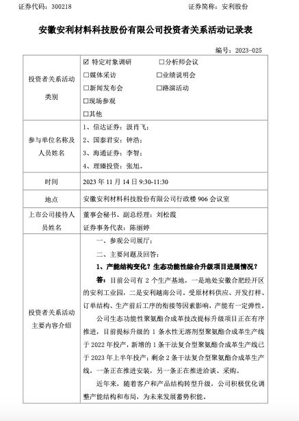 投资者询问,公司产能结构变化?生态功能性综合升级项目进展情况?安利股份回答:目前公司有2个生产基地,一是地处安徽合肥经开区的安利工业园,二是安利越南公司。受原材料供应、开发打样、订单结构、生产前后工序的衔接等因素影响,产能有一定弹性。公司生态功能性聚氨酯合成革技改提标升级项目正在有序推进,目前提标升级的1条水性无溶剂型聚氨酯合成革生产线于2022年投产,新增的1条干法复合型聚氨酯合成革生产线已于2023年上半年投产;剩余2条干法复合型聚氨酯合成革生产线,一条正在推进安装,另一条正在推进洽谈、采购。