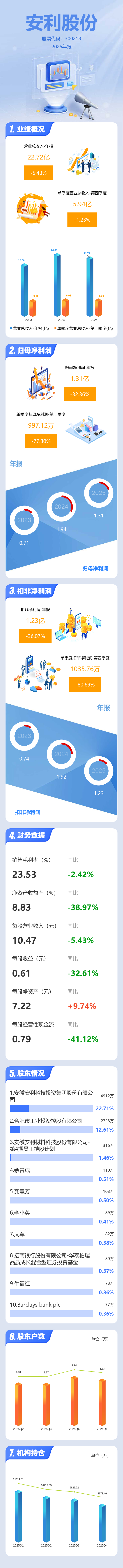 证券之星消息,安利股份2025年年报显示,当年度公司主营收入22.72亿元,同比下降5.44%;归母净利润1.31亿元,同比下降32.36%;扣非净利润1.23亿元,同比下降36.08%;其中2025年第四季度,公司单季度主营收入5.94亿元,同比下降1.24%;单季度归母净利润997.12万元,同比下降77.3%;单季度扣非净利润1035.76万元,同比下降80.69%;负债率31.37%,投资收益-243.3万元,财务费用558.95万元,毛利率23.53%。