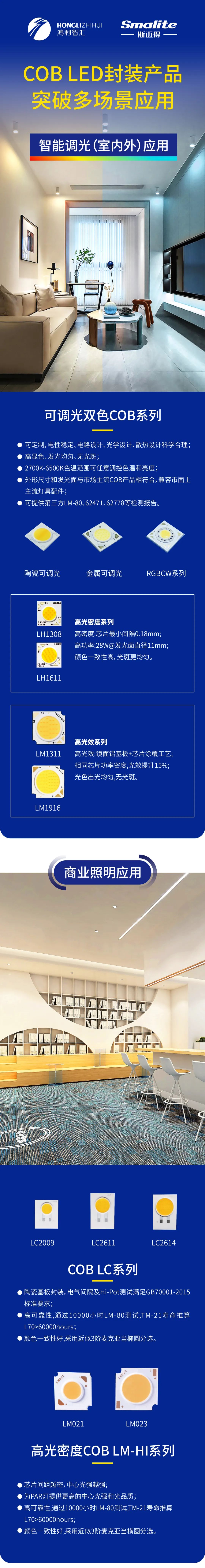 作为国内COB LED封装产品最受青睐的企业之一,鸿利智汇旗下“鸿利光电”和“斯迈得”LED封装品牌,致力于中高端LED封装产品的研究开发,多年来深度耕耘COB LED封装技术,COB LED产品系列全面覆盖客户和市场的应用需求。