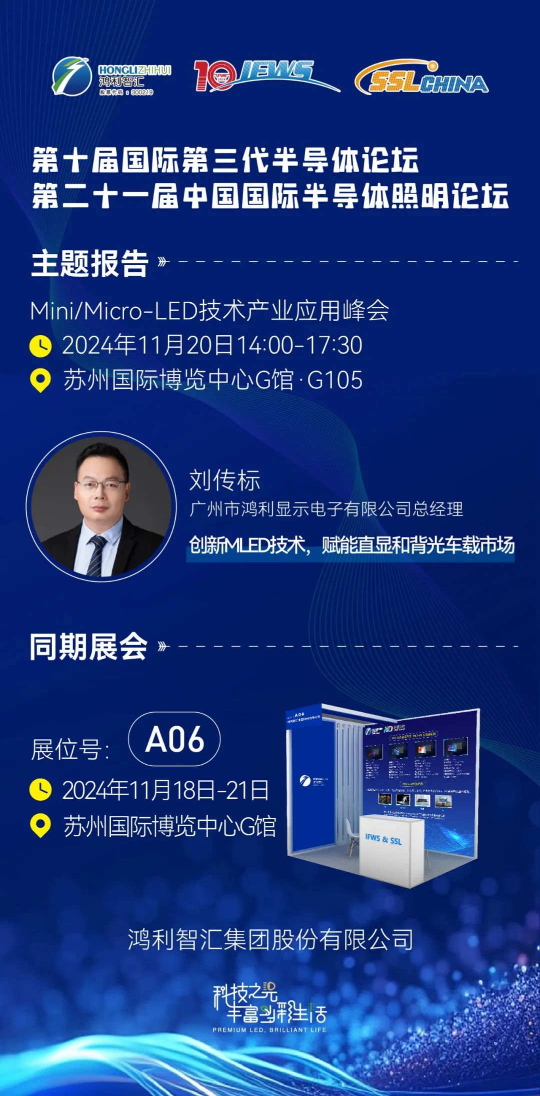 鸿利智汇集团旗下子公司广州市鸿利显示电子有限公司(以下简称“鸿利显示”)总经理刘传标将出席论坛,并在11月20日“Mini/Micro-LED技术产业应用峰会”上,分享《创新MLED技术,赋能直显和背光车载市场》的主题报告,与您共同交流探讨Mini/Micro-LED技术产业应用的最新发展趋势。