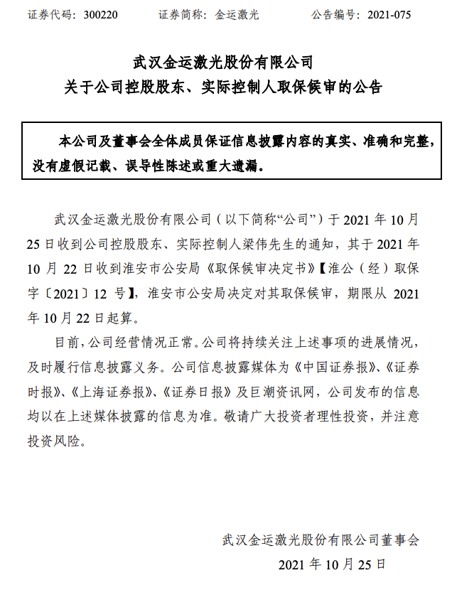 金运激光10月25日发布公告称,公司于2021年10月25日收到公司控股股东、实际控制人梁伟先生的通知,其于2021年10月22日收到淮安市公安局《取保候审决定书》【淮公(经)取保字〔2021〕12号】,淮安市公安局决定对其取保候审,期限从2021年10月22日起算。目前,公司经营情况正常。