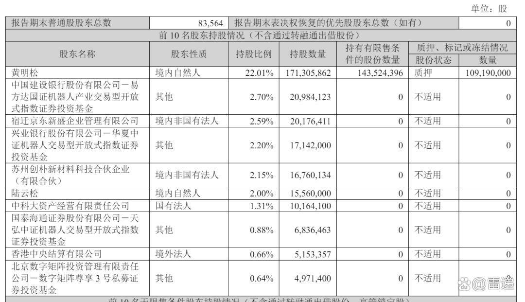 截至2025年9月30日,黄明松持股为22.01%,中国建设银行股份有限公司-易方达国证机器人产业交易型开放式指数证券投资基金持股为2.7%,宿迁京东新盛企业管理有限公司持股为2.59%;