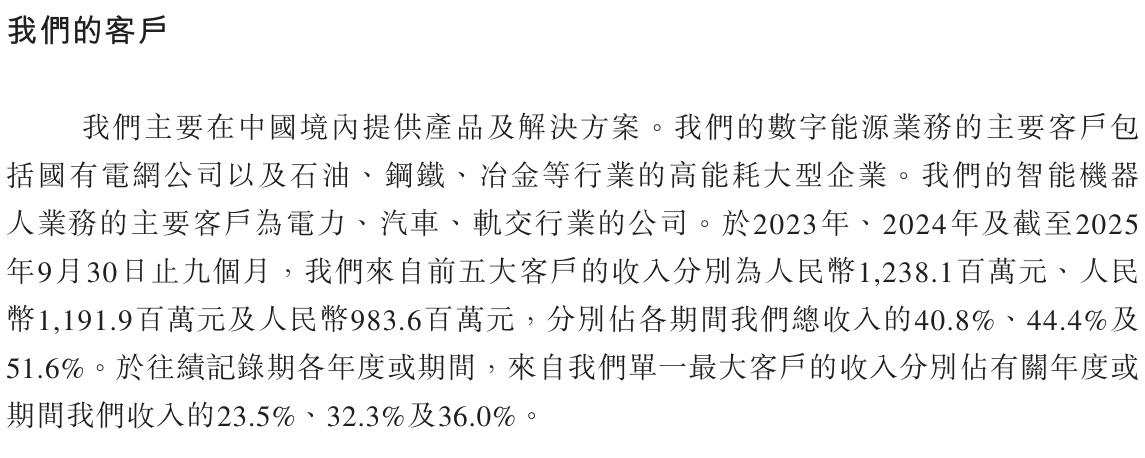 其中单一最大客户(主要指向国家电网及其下属单位)收入占比变化更为突出。从2023年的23.5%上升到2024年的32.3%,2025年前九个月已达36.0%。