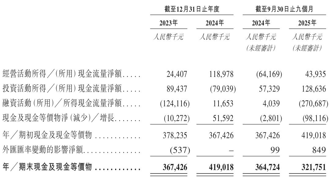 现金流量表显示,报告期内公司经营活动现金流表现与净利润背离明显。2023年经营现金净额2440万元,而同期净利润为亏损1.71亿元;2024年经营现金净额1.19亿元,净利润6157万元;2024年前九个月经营现金净流出6417万元,而同期净利润2239万元;2025年前九个月经营现金净额4394万元,净利润7348万元。部分期间经营现金为正值但低于净利润,2024年前九个月甚至出现净流出,而净利润为正。