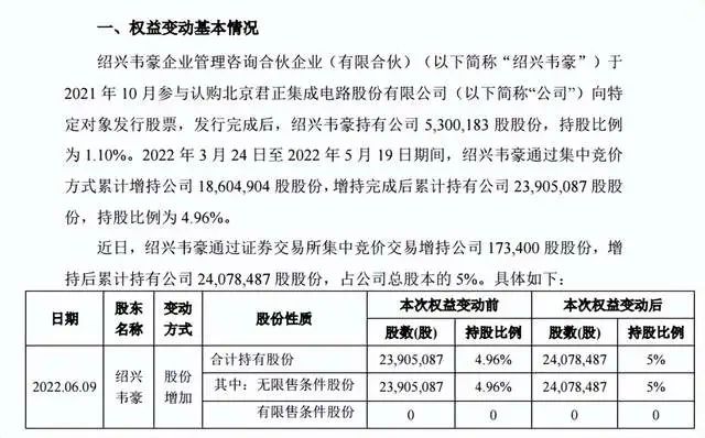 2022年6月份,绍兴韦豪继续通过集中竞价交易增持公司股份,持股比例上升至5%。