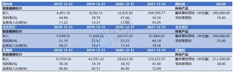 在IPC领域,选取富瀚微、北京君正、国科微的IPC SoC出货数据和经营数据对比来看,三家公司的智能视频领域在2021年均实现了超越以往平均水平的高增长,出货量水平也基本相当,其中国科微的增速较快,主要得益于其在2020年吸纳了H公司的安防芯片团队,各公司毛利率也均处于高位。然而国科微2022前三季度整体毛利率却拉低到19%的经营水平,而富瀚微却整体仍处于毛利率38%的区间,这可能主要得益于富瀚微和海康威视的高度捆绑效应,北京君正的产品也整体处于39%的毛利率水平,君正则主要得益于丰富产品线的布局,存储类产品的旺盛需求填补了智能视频芯片需求的下滑。