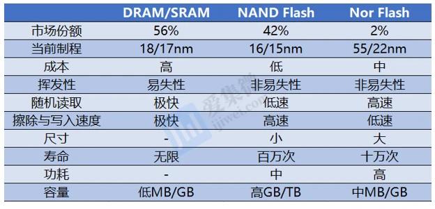 DRAM和FLASHSHI是目前市场上最为重要的存储器芯片。DRAM具有高容量、大宽带、低功耗、短延时和低成本的特征,是个人电脑、服务器、手机等设备的常用内存。SRAM相较DRAM的读写速度更快,功耗水平更低,但是成本高于DRAM。FLASH主要有NAND和NOR两种,区别在于存储单元连接方式的不同,所以两者读取方式不同,其均具有寿命长、体积小、功耗低和非易失性等特点和优势,广泛用于消费电子、网络通信、个人电脑和服务器等领域。