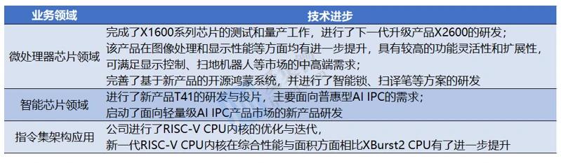 微处理器芯片领域,公司完成了X1600系列芯片的测试和量产工作,进行了下一代升级产品X2600的研发。为更好地进行市场推广,公司对X1600、X2000等开发平台进行了优化与完善,完善了基于新产品的开源鸿蒙系统,并进行了智能锁、扫译笔等方案的研发;智能芯片领域,目前具有面向安防监控市场的IPC产品T系列芯片、面向后端NVR等设备的A1芯片、以及面向泛视频类市场的C100芯片,公司将在A1和C100的基础上分别进行下一代升级产品的研发,从而形成A系列和C系列产品。报告期内,公司进行了新产品T41的研发与投片,该新品主要面向AI IPC市场,与T31/T40等芯片形成面向不同市场需求的产品梯队;此外,随着RISC-V架构的发展,公司的部分芯片产品也采用了公司自研的RISC-V CPU核,随着技术发展和市场需求情况,会陆续推出基于RISC-V架构的芯片产品。
