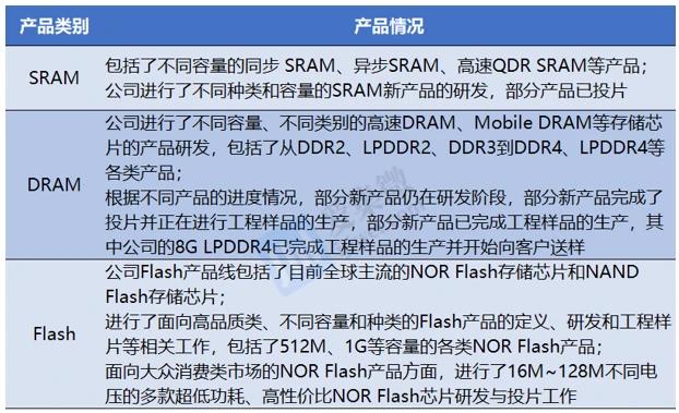 北京君正存储芯片分为SRAM、DRAM和Flash三大类别,主要面向汽车、工业、医疗等行业市场及高端消费类市场。其中公司SRAM产品品类比较丰富,包括了不同容量的同步SRAM、异步SRAM、高速QDR SRAM等产品,公司也同时对不同种类和容量的SRAM新产品进行了研发,部分产品已经投片;公司的DRAM产品开发主要针对具有较高技术壁垒的专业级应用领域,可向客户提供不同容量、不同界面和不同功耗规格的产品,能够满足工业、医疗、主干通讯和车规等级产品的要求,具备在极端环境下稳定工作、节能降耗等特点;公司Flash产品线包括了目前全球主流的NOR Flash存储芯片和NAND Flash存储芯片,报告期内,公司进行了面向高品质类、不同容量和种类的Flash产品的定义、研发和工程样片等相关工作,包括了512M、1G等容量的各类NOR Flash产品。面向大众消费类市场的NOR Flash产品方面,公司进行了16M~128M不同电压的多款超低功耗、高性价比NOR Flash芯片研发与投片工作。