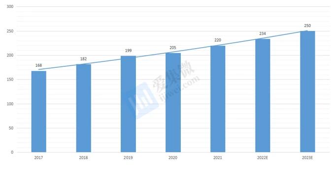 图10:2017-2023年全球安防视频监控设备市场规模预测趋势图(亿美元)