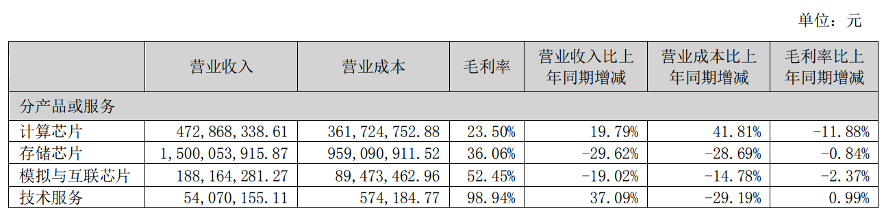 按业务划分,报告期内计算芯片营收4.73亿,同比增长19.79%;存储芯片业务营收15亿,同比下滑29.62%;模拟与互联芯片业务营收1.88亿,同比下滑19.02%;技术服务营收5407万,同比增加37.09%。