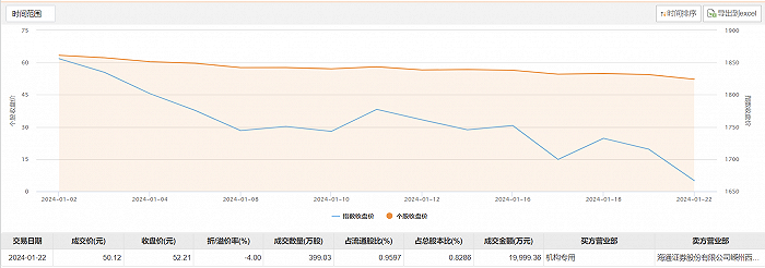 1月22日,北京君正今日大宗交易成交399.03万股,成交额2.0亿元,占当日总成交额的32.68%,成交价50.12元,较市场收盘价折价4.0%。