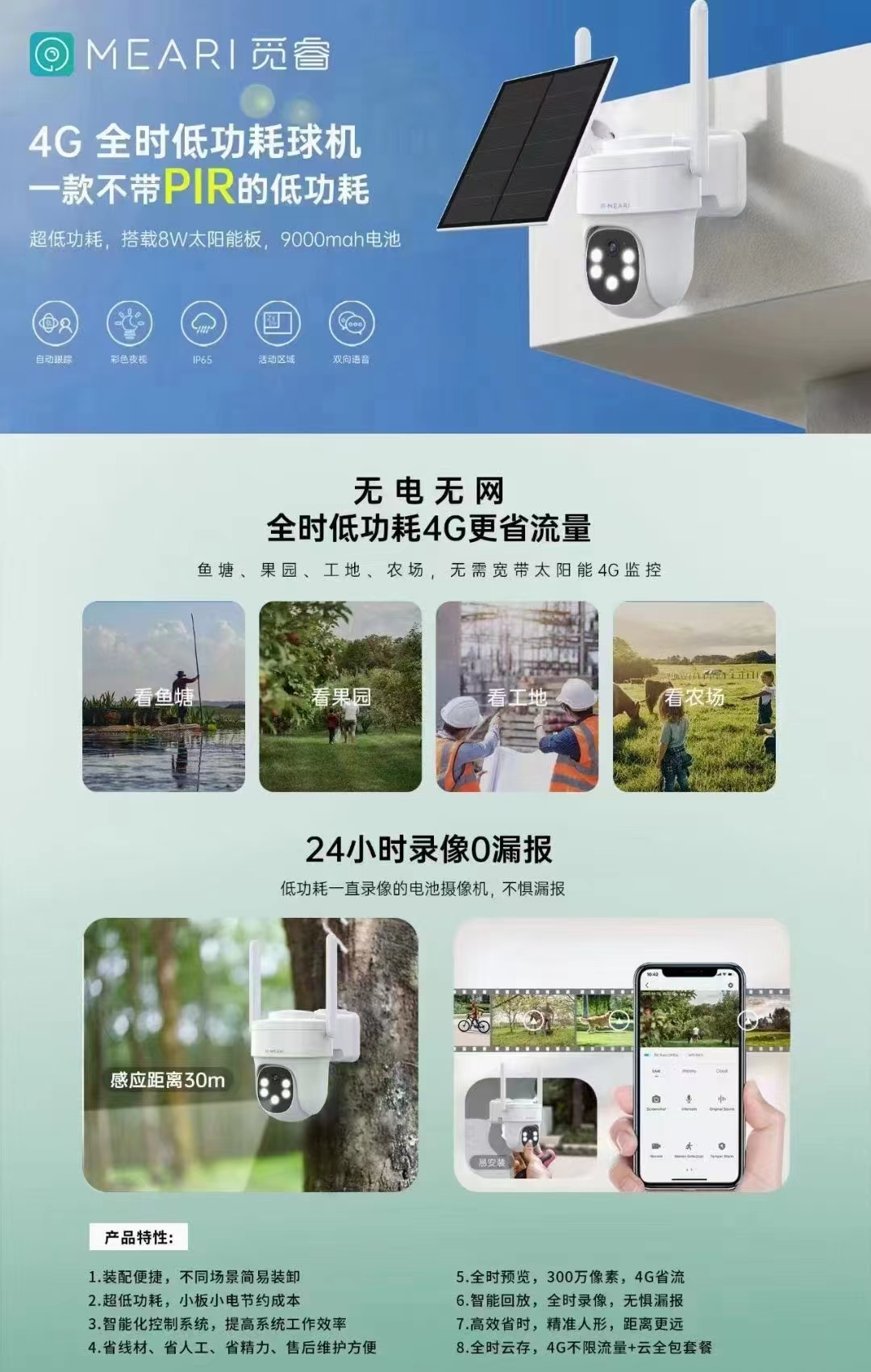 基于北京君正全栈自研的低功耗、音视频编码、AI、ISP、NPU、CPU等核心技术,觅睿24小时录像0漏报AOV低功耗产品可实现全时录像、人形侦测、双向语音对讲、智能回放等功能,在户外或者野外场景都非常适用,比如种植养殖场、高速公路、水文水利、海岛边防、地质灾害监控等,无网无电、使用太阳能供电、4G传输,并需要满足24小时不间断监控。