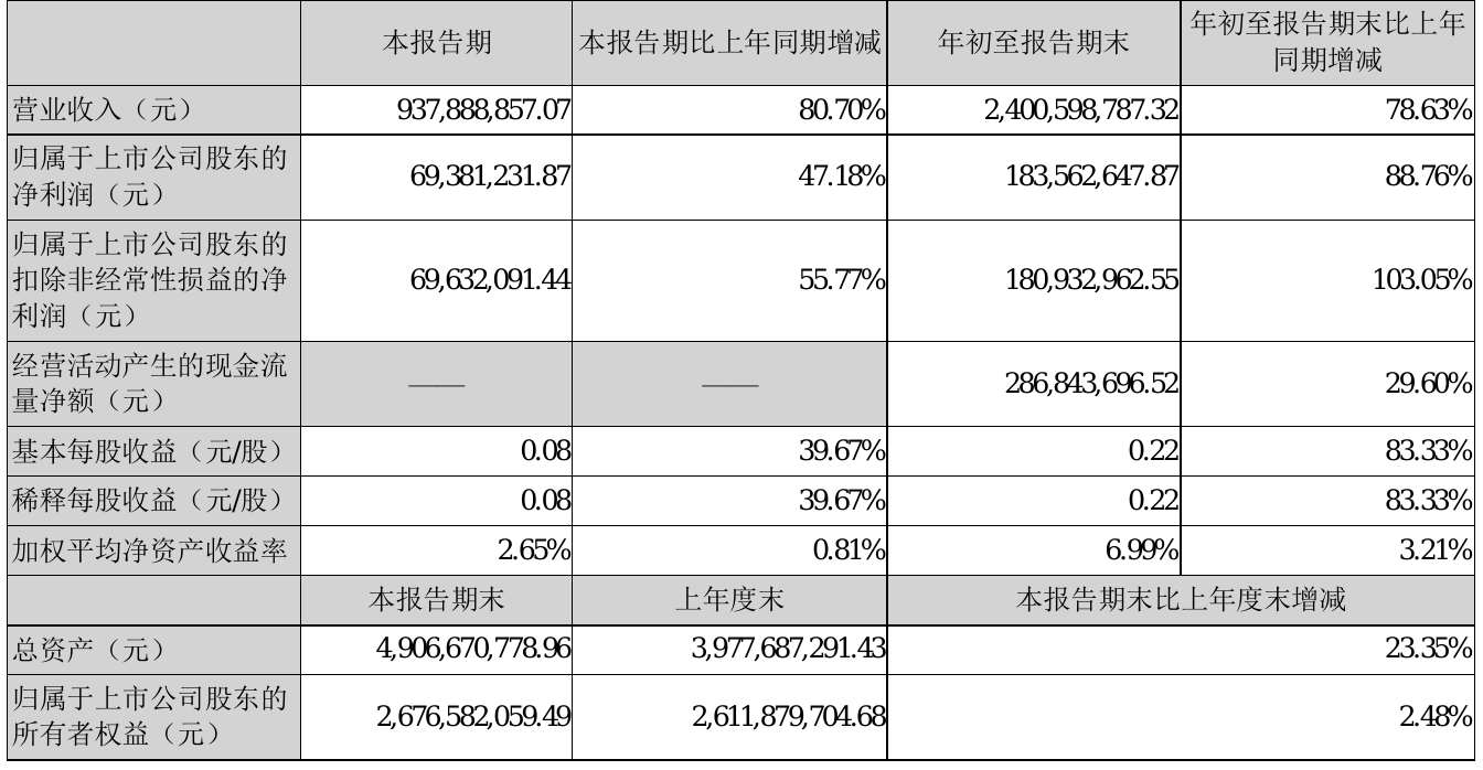 挖贝网10月25日,正海磁材(300224)近日发布2021年前三季度报告,报告期内营业收入2,400,598,787.32元,同比增加78.63%;净利183,562,647.87元,同比净利增加88.76%。